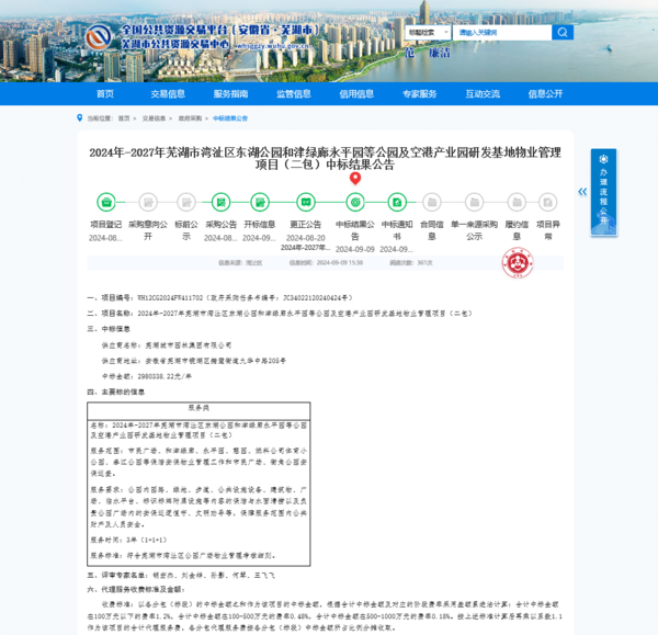 2024年9月9日,蕪湖城市園林集團(tuán)有限公司成功中標(biāo)2024年-2027年蕪湖市灣沚區(qū)東湖公園和津綠廊永平園等公園及空港產(chǎn)業(yè)園研發(fā)基地物業(yè)管理項(xiàng)目(二包),這一標(biāo)志性的中標(biāo)事件不僅代表了園林集團(tuán)在灣址區(qū)物業(yè)管理市場(chǎng)的首次亮相,也是對(duì)公司綜合服務(wù)能力的肯定。