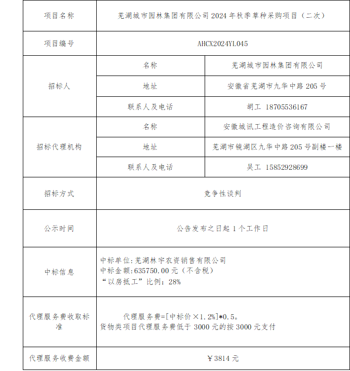 蕪湖城市園林集團有限公司2024年秋季草種采購成交結(jié)果公告(二次)