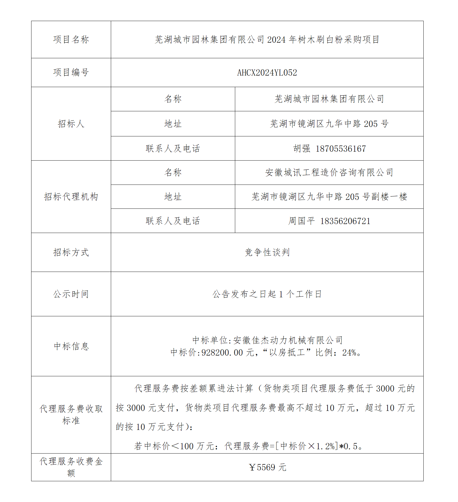 蕪湖城市園林集團有限公司2024年樹木刷白粉采購項目中標(biāo)結(jié)果公告