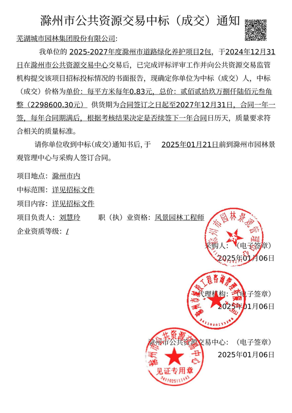 歲序更替,華章又新,園林集團中標喜訊傳來,成功斬獲2025-2027年度滁州市道路綠化養(yǎng)護項目2包,實現(xiàn)開門紅,獻上新春賀禮。此次中標,是園林集團在滁州市綠化市場的首次亮相,也是公司在蕪湖市外業(yè)務拓展的重大突破。