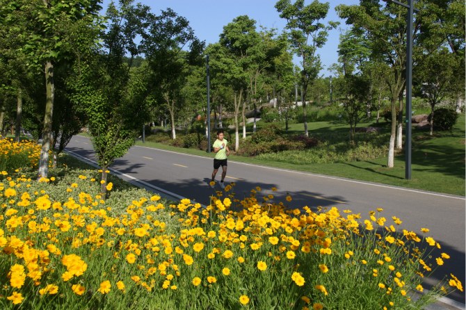 在神山公園南側7米主園路內(nèi),有一片運動健身區(qū),占地約2.3萬平方米。這里有新建的網(wǎng)球場、籃球場和五人足球場,學習工作之余,約上三五好友來一場球賽,娛樂與健身雙豐收,豈不美哉?