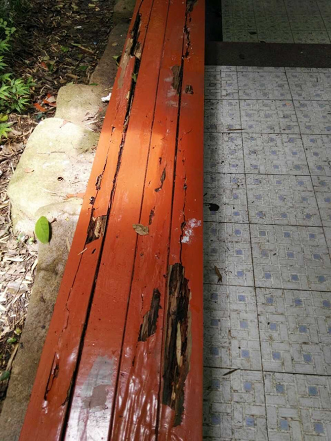 •     文明城市創(chuàng)建迎檢期間,公司對(duì)赭山公園內(nèi)的基礎(chǔ)設(shè)施進(jìn)行全面檢查,檢查中發(fā)現(xiàn)公園長廊有部分座椅腐爛,在維修過程中發(fā)現(xiàn)長廊座椅下有少量白蟻,因此,公司立即與白蟻防治所聯(lián)系。