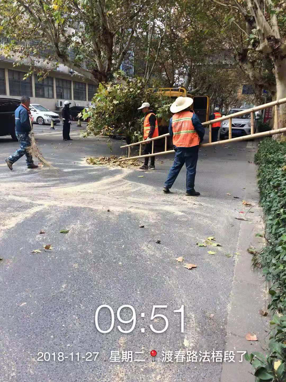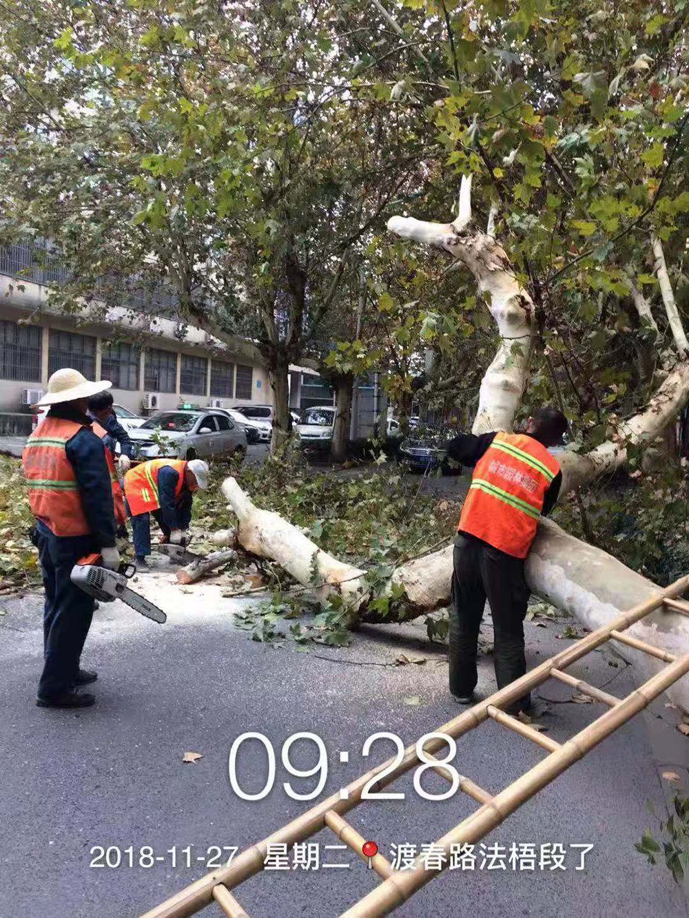 11月27日上午8時(shí)40分,渡春路上一棵有著多年歷史的高大法梧突然傾倒。上午9時(shí)左右接到110報(bào)警平臺(tái)電話,我們 當(dāng)時(shí)即組織20多位施工人員并調(diào)配3輛搶險(xiǎn)車及時(shí)趕到出事現(xiàn)場(chǎng)。倒下的法梧樹已完全占據(jù)了機(jī)動(dòng)車道,幸運(yùn)的是沒有砸到任何人員和車輛。為減少對(duì)路面的阻擋,我們先鋸斷倒在機(jī)動(dòng)車道上的法梧樹的枝干、樹樁,然后依次裝到搶險(xiǎn)車上運(yùn)走。鏡湖交警大隊(duì)八中隊(duì)的交警們維持秩序,引導(dǎo)車輛從道路南側(cè)繞行。經(jīng)過半小時(shí)搶險(xiǎn),道路已經(jīng)暢通了。
