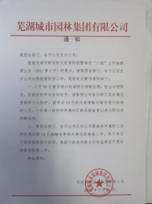 7月20日,南京祿口機(jī)場(chǎng)例行核酸檢測(cè),檢出9例陽(yáng)性。情況發(fā)生后,園林集團(tuán)黨委高度重視。結(jié)合市新冠疫情防控暨推進(jìn)“六穩(wěn)”工作指揮部(2021第2號(hào))文件精神,集團(tuán)公司主要領(lǐng)導(dǎo)第一時(shí)間作出批示,立即啟動(dòng)《園林集團(tuán)新冠從嚴(yán)快速做好各項(xiàng)防控措施》。