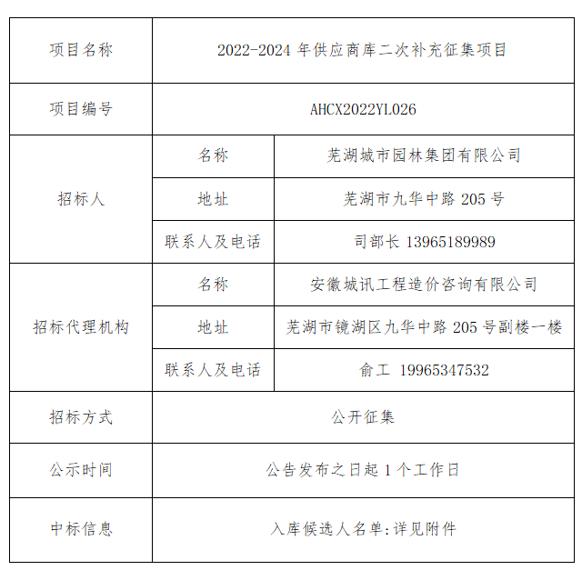 2022-2024年供應(yīng)商庫(kù)二次補(bǔ)充征集項(xiàng)目中標(biāo)結(jié)果公告