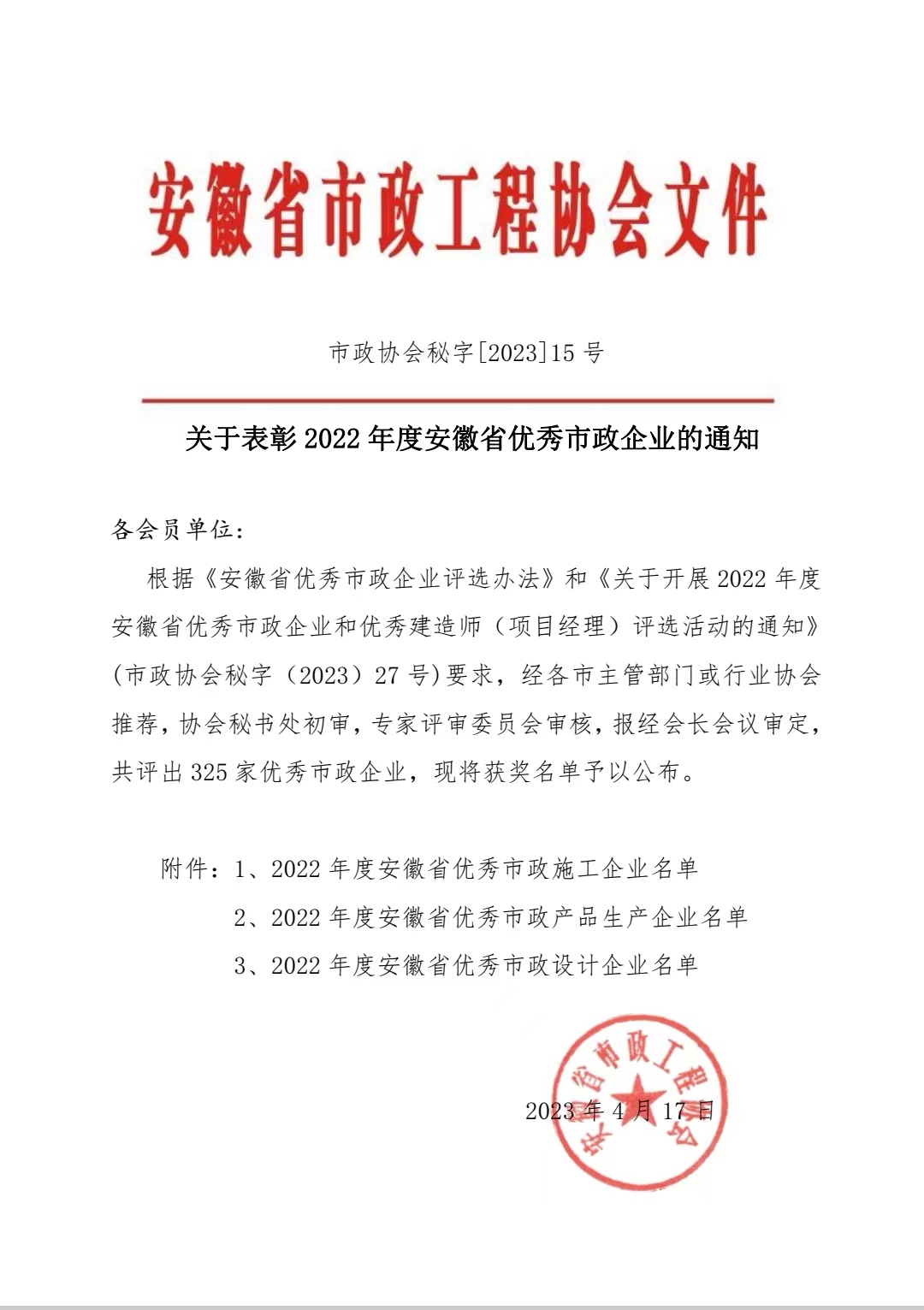 近日,安徽省市政工程協(xié)會(huì)公布2022年度安徽省優(yōu)秀市政企業(yè)名單,園林集團(tuán)榮獲“2022年度安徽省優(yōu)秀市政企業(yè)”榮譽(yù)稱(chēng)號(hào)。