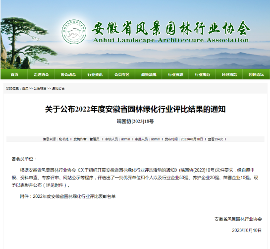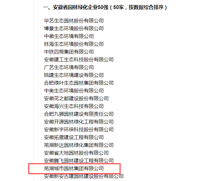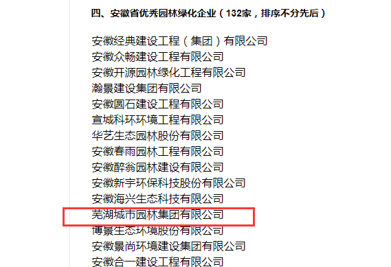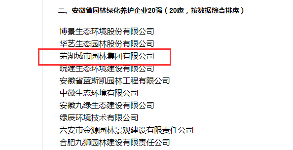 2023年8月10日,經過自愿申報、材料初審、專家評審、信用篩查等程序,安徽省風景園林行業(yè)協會開展的安徽省園林綠化行業(yè)評比結果出爐,蕪湖城市園林集團憑借強勁的綜合實力脫穎而出,分別榮獲2023年安徽省園林綠化養(yǎng)護企業(yè)20強(第3名),2023年安徽省園林綠化企業(yè)50強(第20名),2023年安徽省優(yōu)秀園林綠化企業(yè)和2023年安徽省優(yōu)秀養(yǎng)護企業(yè)四項企業(yè)榮譽。與此同時,集團夏登彬同志榮獲2023年安徽省優(yōu)秀企業(yè)經理,王義強同志榮獲2023年安徽省優(yōu)秀項目經理,陶俊、汪苑竹同志榮獲2023年安徽省優(yōu)秀工程師。