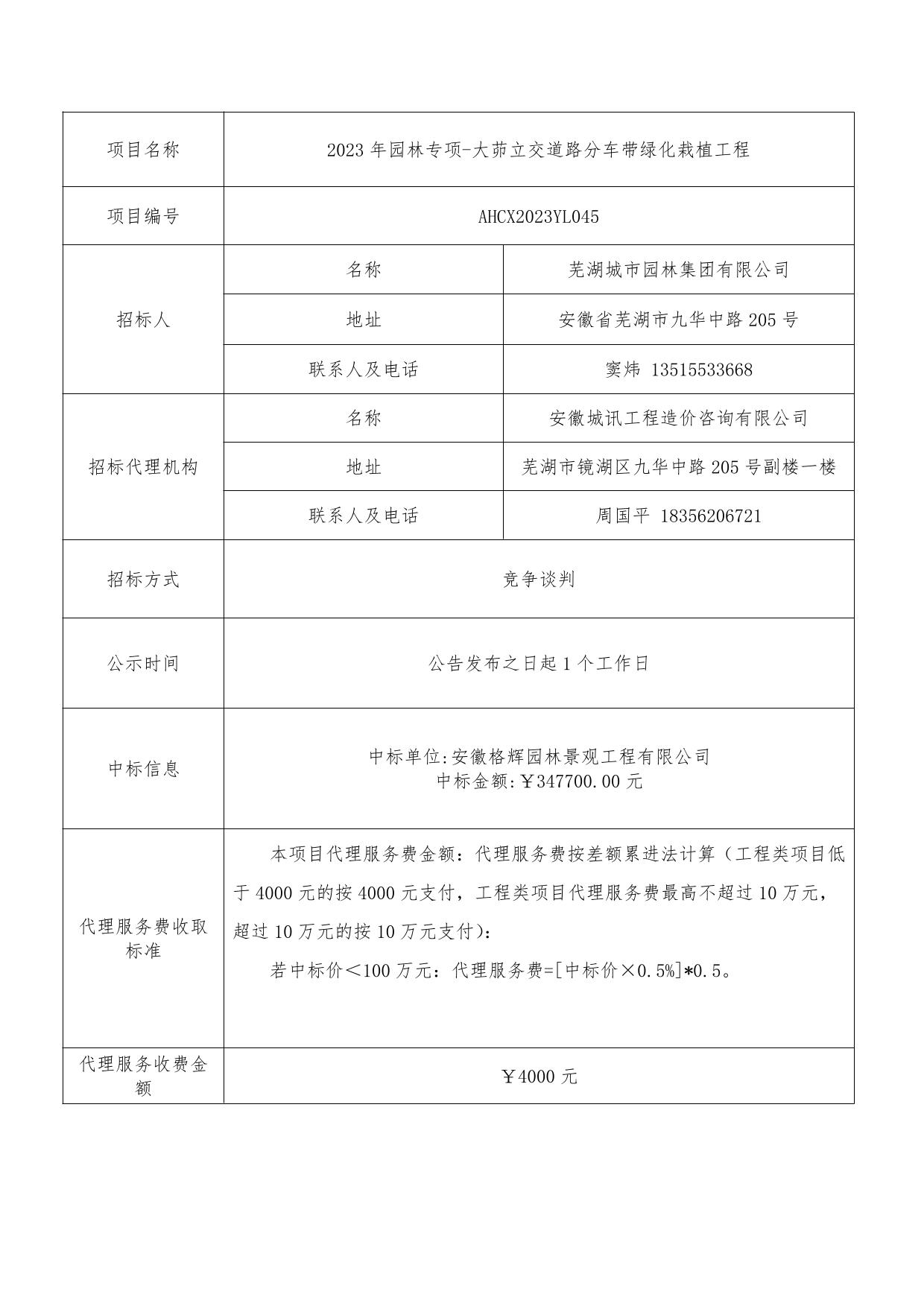 2023年園林專項-大茆立交道路分車帶綠化栽植工程中標(biāo)結(jié)果公示