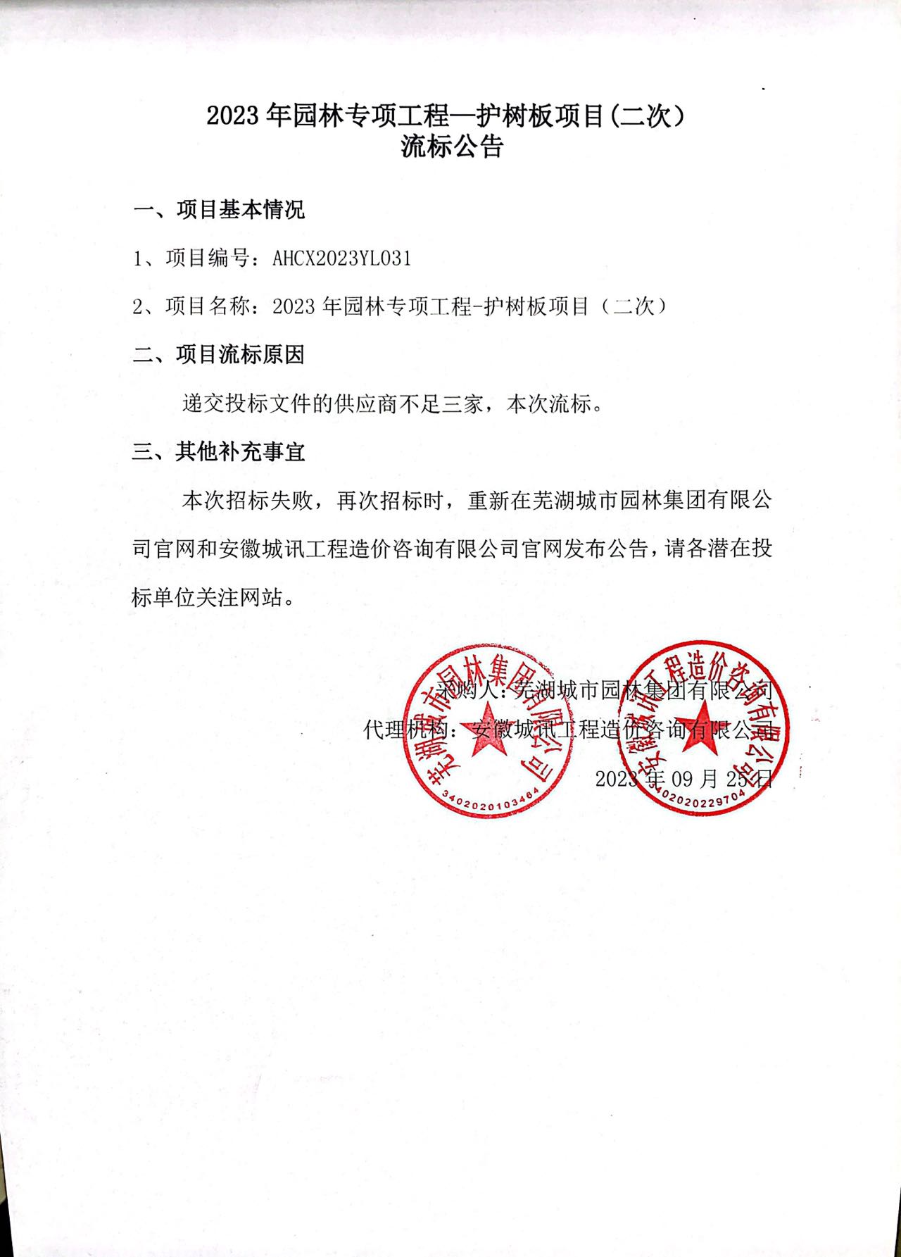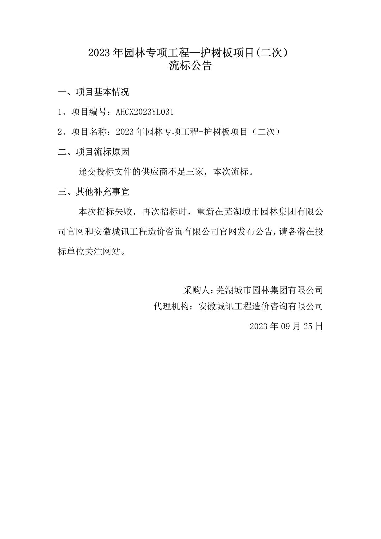 2023年園林專項(xiàng)工程—護(hù)樹板項(xiàng)目(二次)流標(biāo)公告