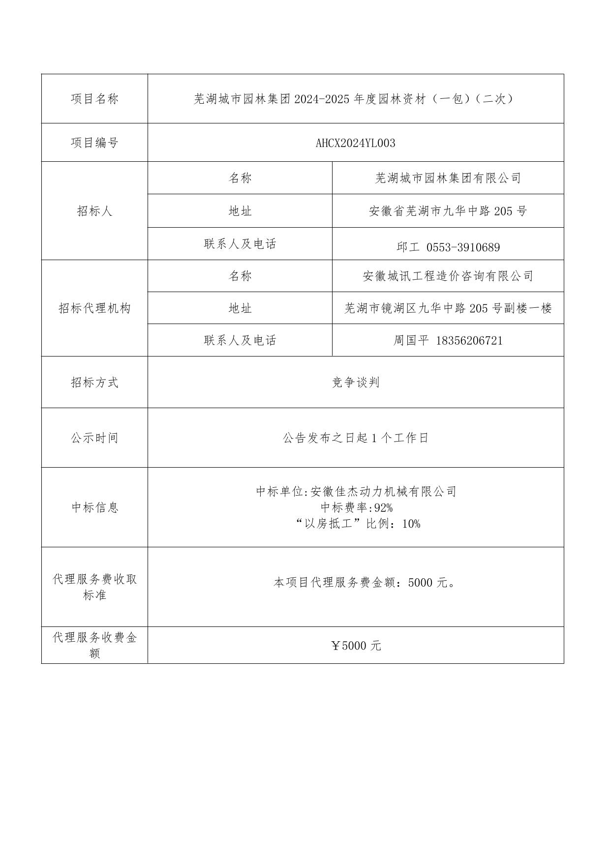 蕪湖城市園林集團(tuán)2024-2025年度園林資材(一包)(二次)成交結(jié)果公
