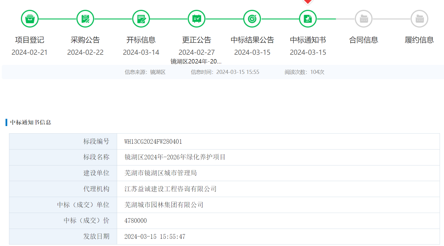 2024年3月,蕪湖城市園林集團中標鏡湖區(qū)2024年-2026年綠化養(yǎng)護項目,中標總價1434萬元,合同期為3年。
